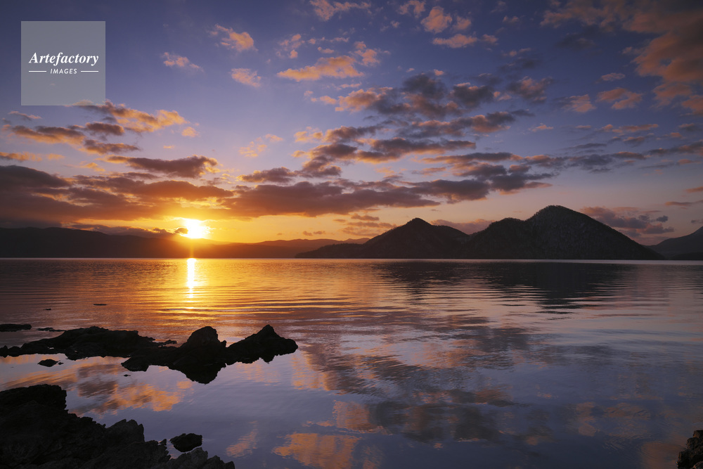 作品タイトル     洞爺湖と中島の日の出 モデルリリース なし