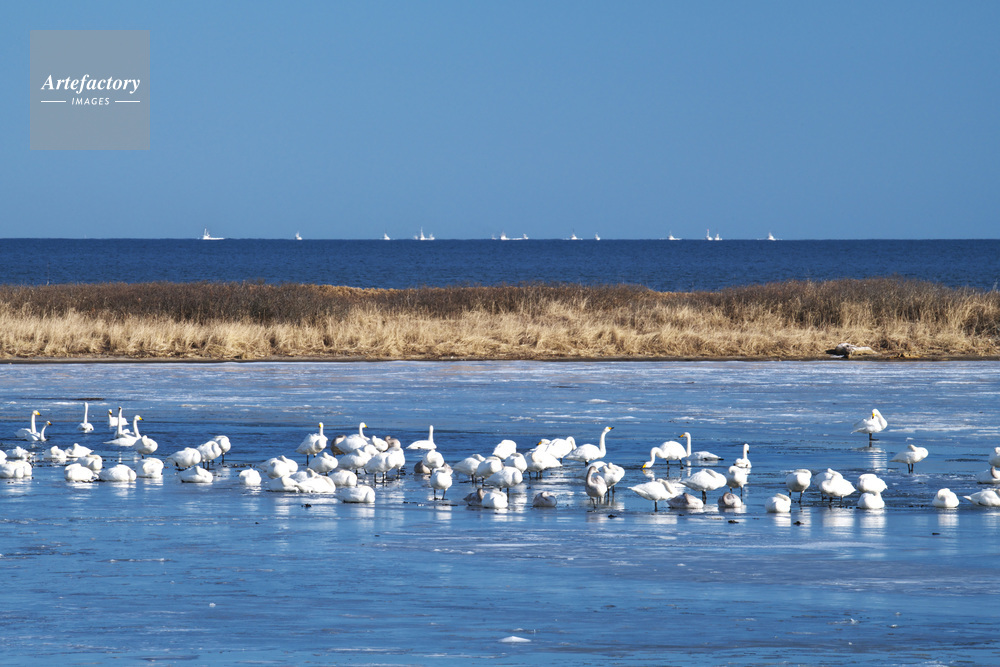 作品タイトル     春別川のハクチョウと根室湾とホタテ船 モデルリリース なし
