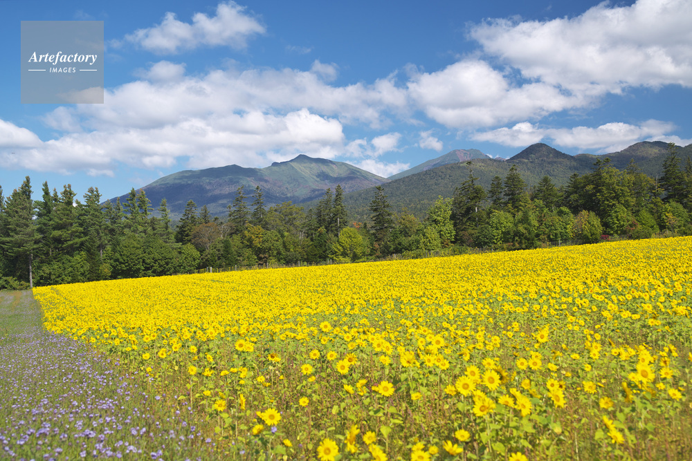 | 作品タイトル | 麓郷展望台のヒマワリ畑と十勝岳連峰 | モデルリリース | なし | |