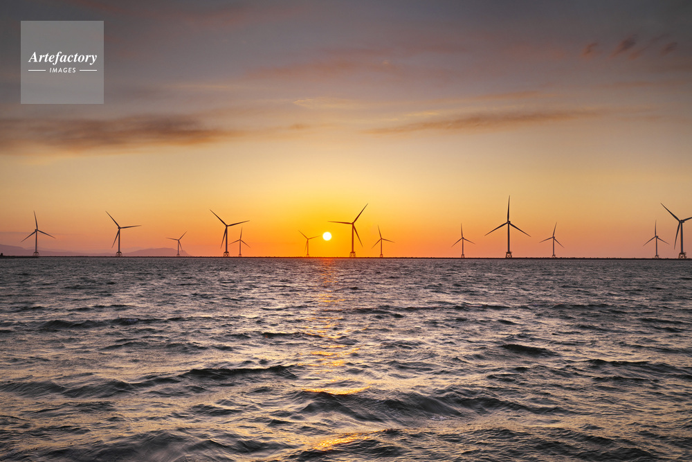 作品タイトル     石狩湾と洋上風力発電の日没 モデルリリース なし