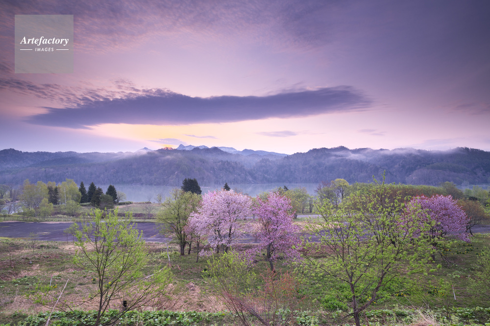 作品タイトル     夕張川(シューパロ湖)と夕張山地の朝と桜 モデルリリース なし