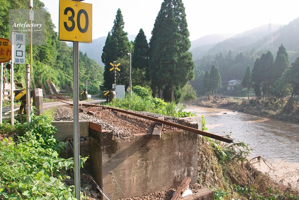 | 作品タイトル | 豪雨の被害、流された鉄橋の線路、JR西日本越美北線(九頭竜線) | モデルリリース | なし | |