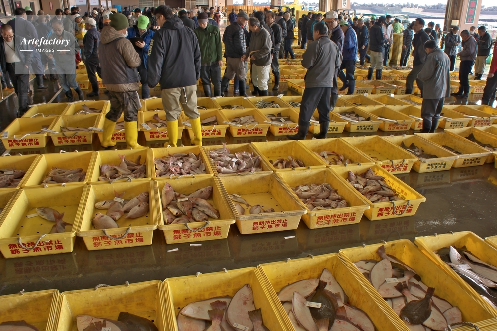| 作品タイトル | 銚子漁港、底引き網漁の水揚げ、競り(入札) | モデルリリース | なし | |