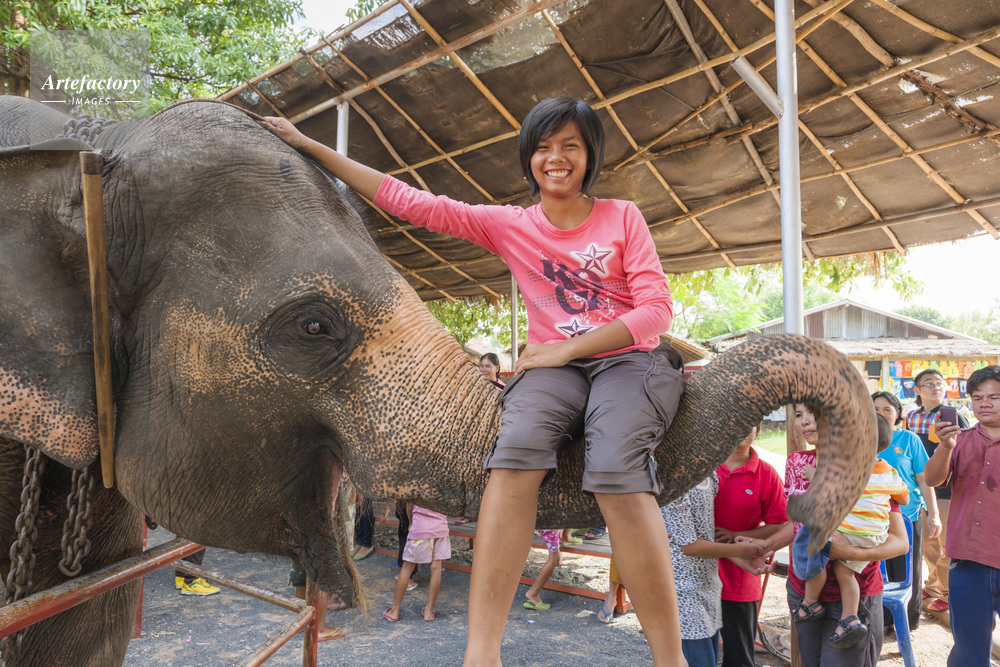 | キャプション | ゾウのショー ゾウの鼻に乗る観光客の女性 | 制限事項 | ||