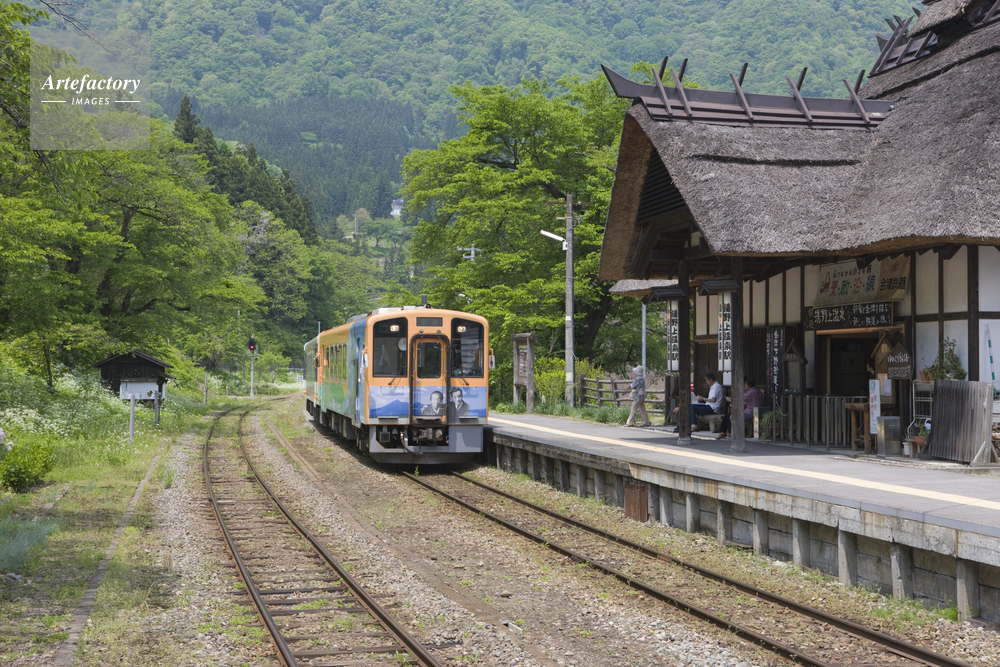 作品タイトル     新緑の湯野上温泉駅と列車 モデルリリース なし