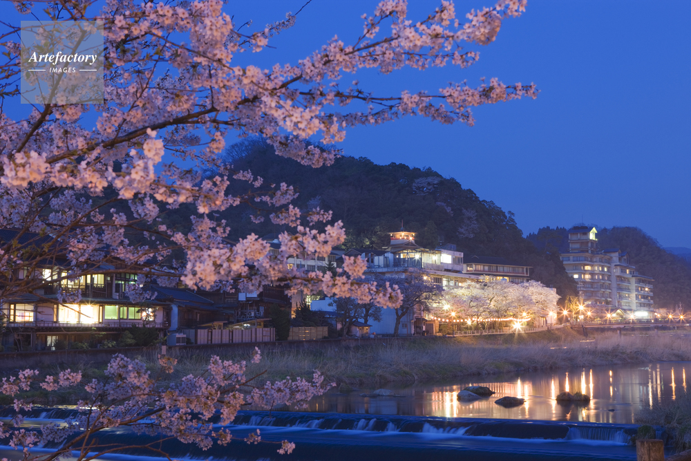 | 作品タイトル | 三朝温泉と三朝川と桜と夕景 | モデルリリース | なし | |
