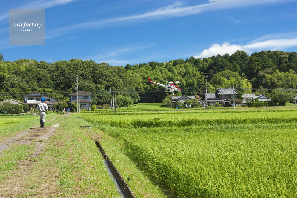 | キャプション | ラジコンヘリコプター 農薬散布 人 お米 水田 イネ 人 青空 雲 農業 | 制限事項 | ||