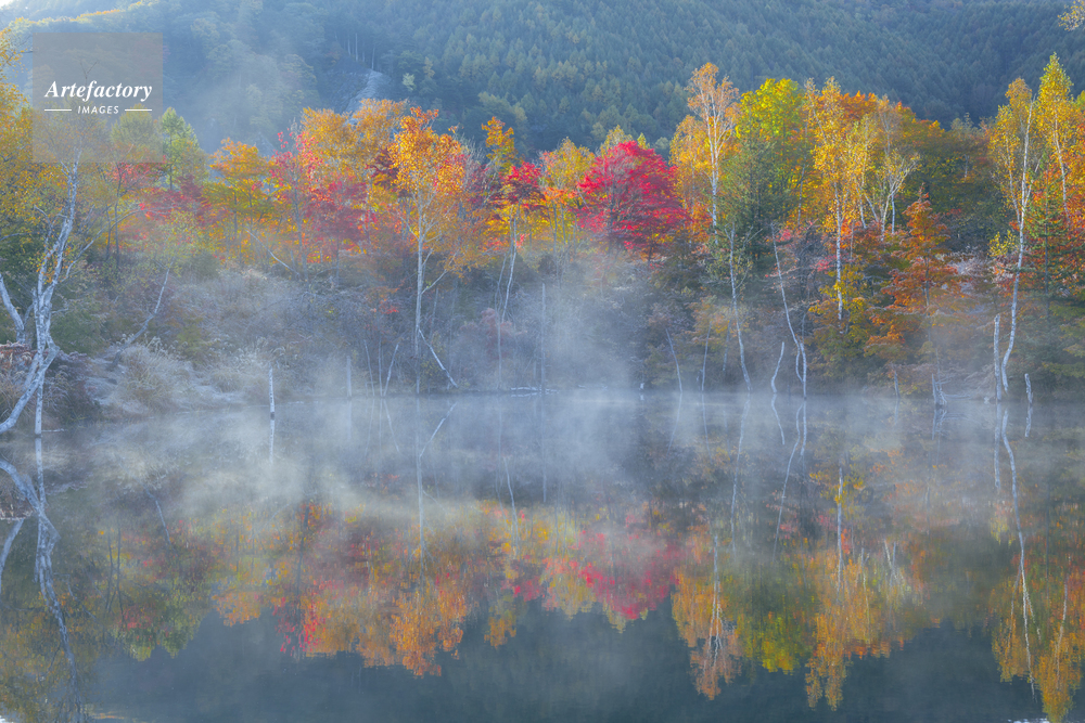 | 作品タイトル | 紅葉のまいめの池と朝霧 | モデルリリース | なし | |