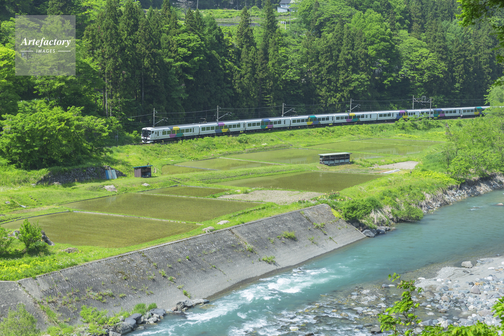 | 作品タイトル | 新緑の電車と姫川 | モデルリリース | なし | |