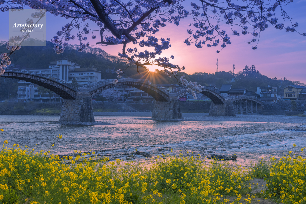 作品タイトル     朝日に輝く桜と錦帯橋 モデルリリース なし