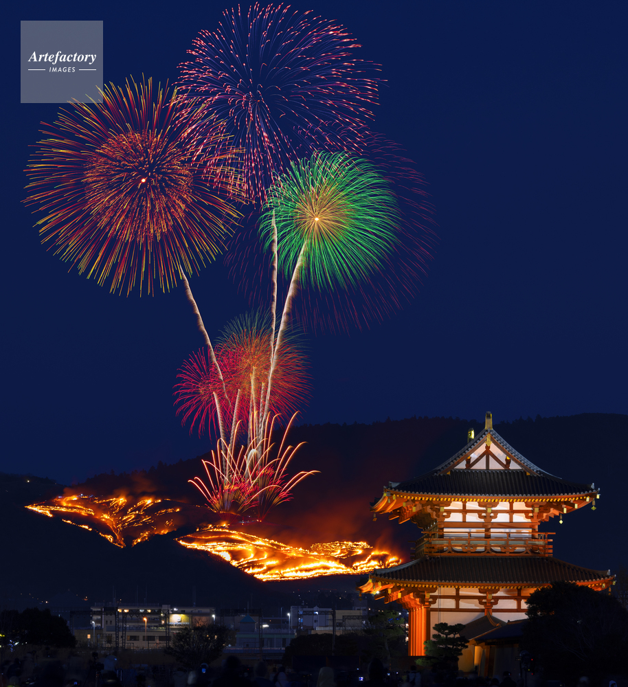 | 作品タイトル | 平城宮跡の朱雀門と若草山の山焼きと花火 | モデルリリース | なし | |