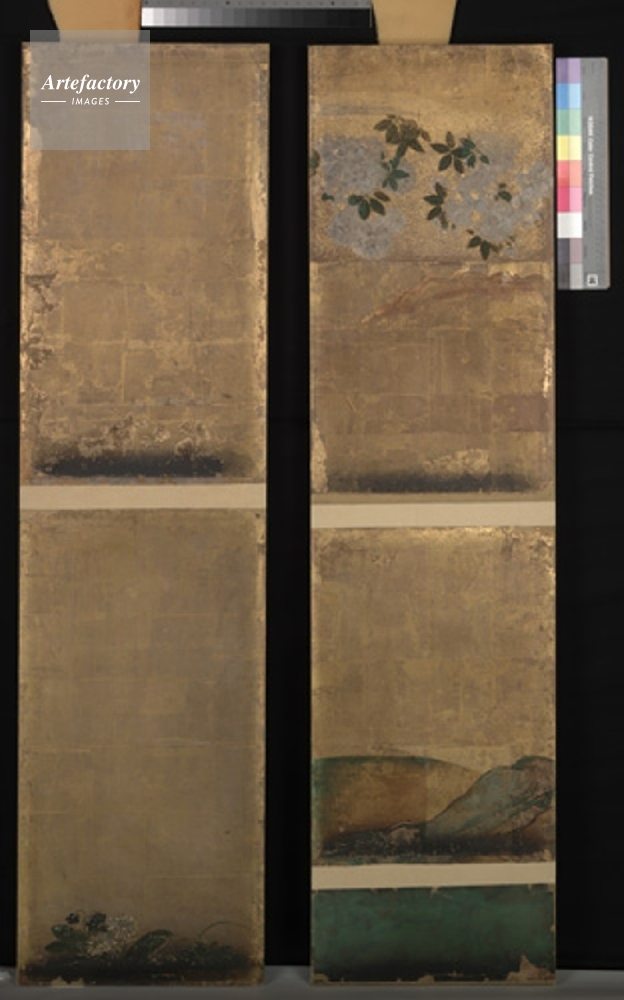 | キャプション | 黒書院,一の間,違棚袖貼付下部,東面,北より2,紙本金地著色,重要文化財,二の丸御殿 | 制限事項 | ||