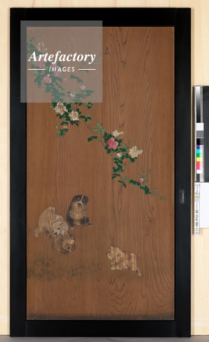 | 作品タイトル | 御常御殿 渡廊下 杉戸 南面 東より2 板絵著色 薔薇に狗子図 | モデルリリース | なし | |