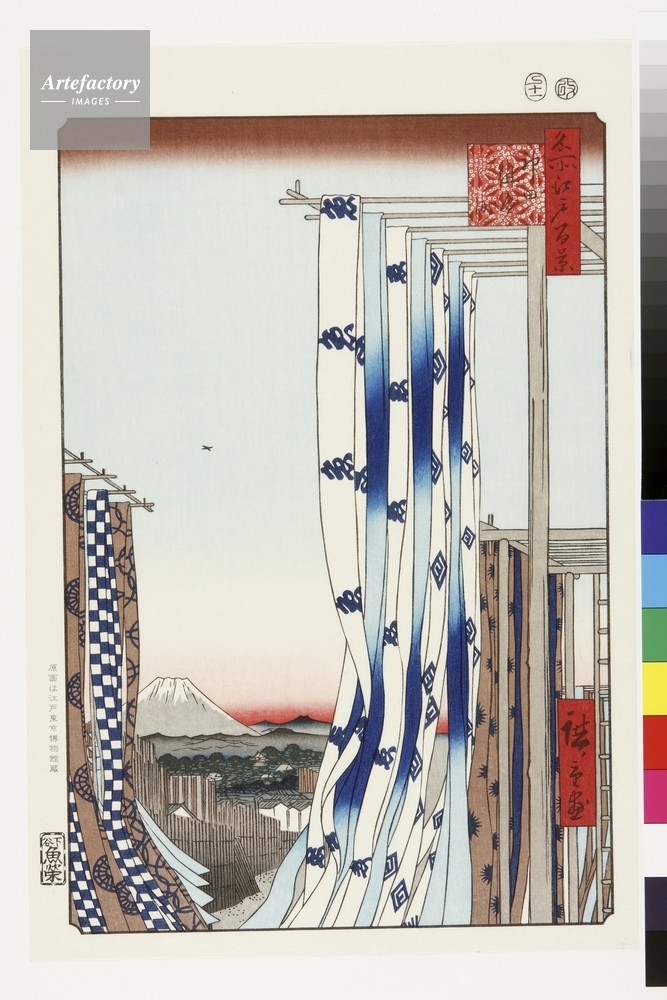 | キャプション | 浮世絵復刻版画 / 藍染めの職人が集住したのが「紺屋町」。染め上げた生地は、屋根の上の干し場で乾燥させた。生地の白地部分には繊細な特殊技法の布目摺りが施されている。神田の町名には他に鍛冶町=鋳物、須田町=水菓子果物、乗物町=駕篭等がある。 | 制限事項 | ||