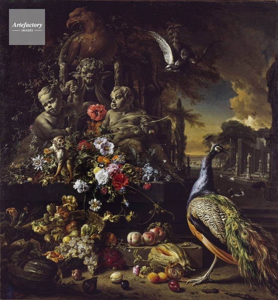 | キャプション | A peacock in the right foreground, and a statue in the centre surrounded by flowers and fruit including pomegranites, plums, apricots, grapes, apples, passion-flowers, poppies and cornflowers. There is a diving sparrowhawk above in the sky. | 制限事項 | ||