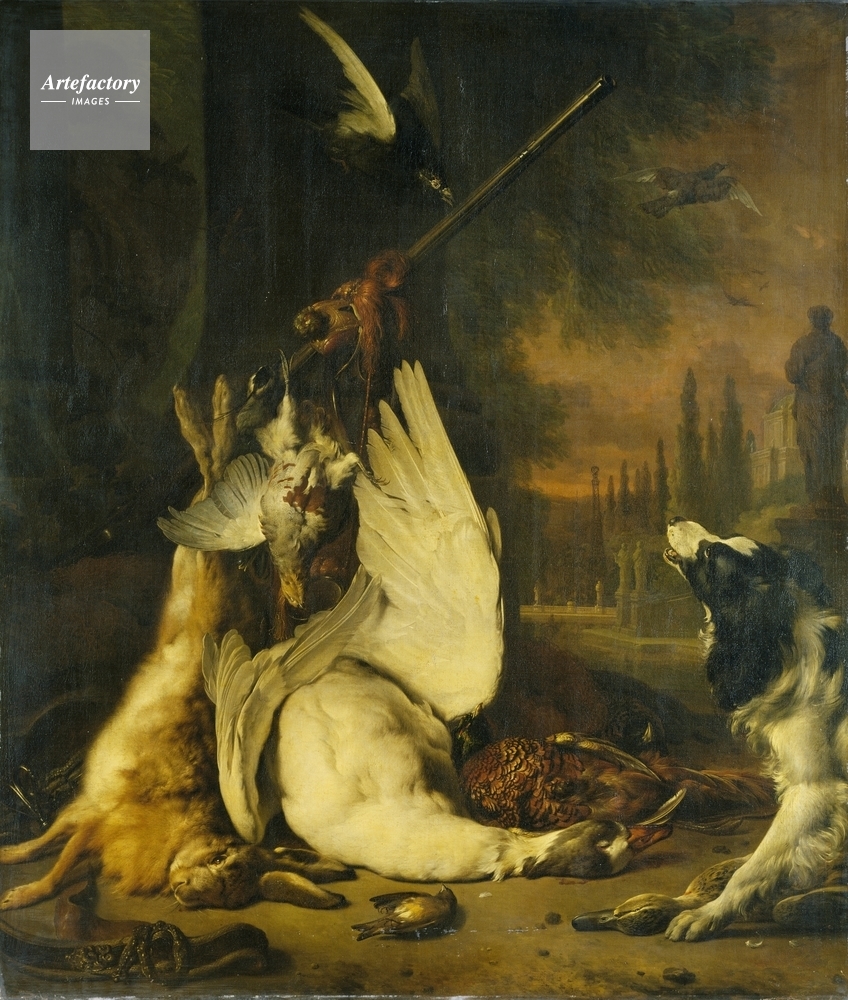 | キャプション | A group of dead birds, including a swan, mallard duck, a brace of pheasant and a goose. Also a hare hangs tied in the left foreground. In the bottom left is a hunting bag, and to the bottom right a black a white dog. | 制限事項 | ||