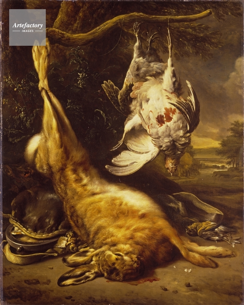 | キャプション | A dead hare, dead partridges, and a greenfinch by a tree, with an animal skin hunting bag to the bottom left. Signed, top left. | 制限事項 | ||