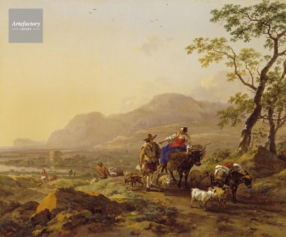 | キャプション | A woman riding an ox with a herdsman, a laden mule, a dog, sheep and goats on a dirt road in a hilly italiannate landscape at evening; other herdsmen with sheep and cattle beyond. | 制限事項 | ||
