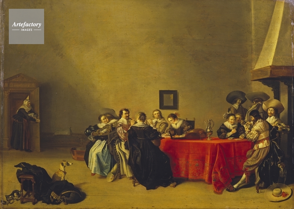 | キャプション | A brothel scene. Women and soldiers seated around a table covered with a red cloth, playing cards and making music. In the left foreground are a dog, a lute and a discarded rapier. | 制限事項 | ||