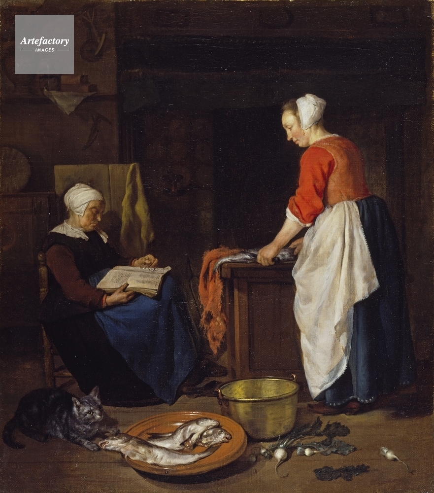 | キャプション | A woman asleep with the Bible on her lap and a pair of spectacles in her left hand. A younger woman wears a blue skirt and red blouse, and in the foreground a cat eyes a plate of fish. A representation of the need for physical and spiritual vigilance. | 制限事項 | ||