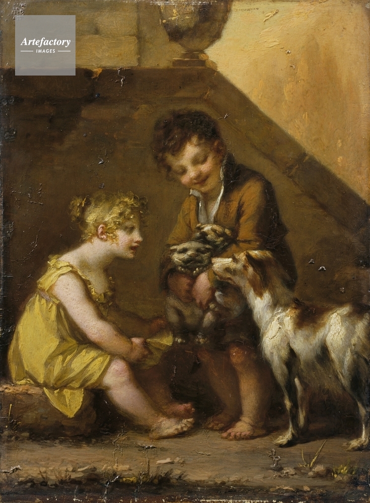 | キャプション | A little boy and girl, playing with a dog and two puppies. | 制限事項 | ||