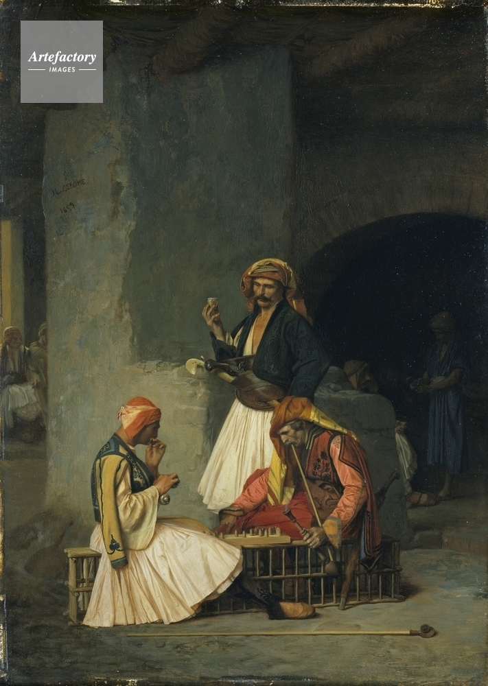 | キャプション | Two men playing draughts. The man sitting on the left has a red head-dress, the man sitting on the right wears red with a yellow and brown head-dress. Behind them the spectator is armed with a flint-lock pistol and an ivory-handled yataghan. | 制限事項 | ||