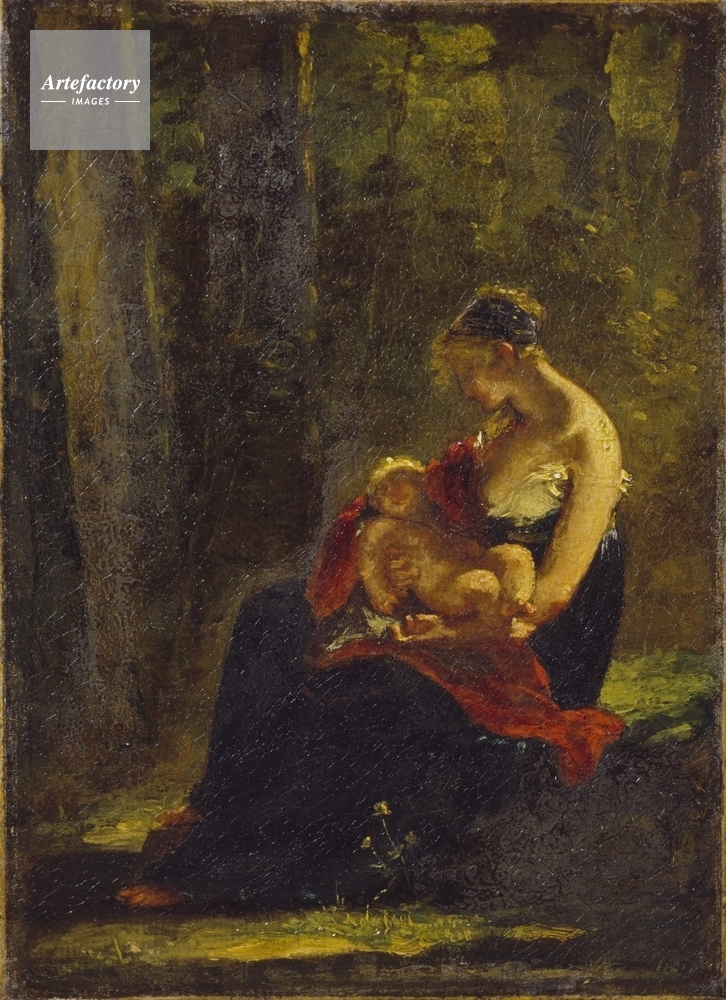 | キャプション | A woman dressed in classicizing drapery, her right breast uncoverd, seated in a woodland glade, with her sleeping infant in her lap. | 制限事項 | ||