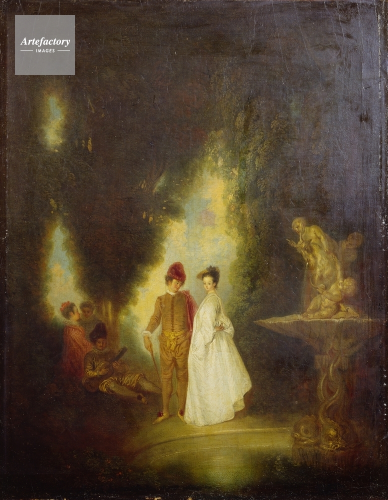 | キャプション | Two central figures walking through a park, a man in a pink suit and a lady in a white gown. To their left is a fountain comprising a statue with putti on a carved base. Other figures can be seen in the background. A copy of a composition by Watteau. | 制限事項 | ||