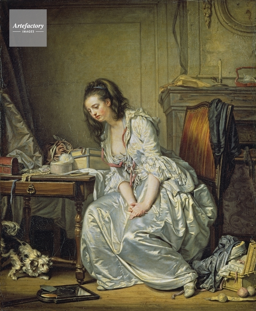 | キャプション | A woman looking down at a broken mirror. She wears a white satin dress and a blue ribbon is in her brown hair. A dog is on the left. A shawl hangs over her chair and pearls with other objects are scattered on the table to the left. | 制限事項 | ||