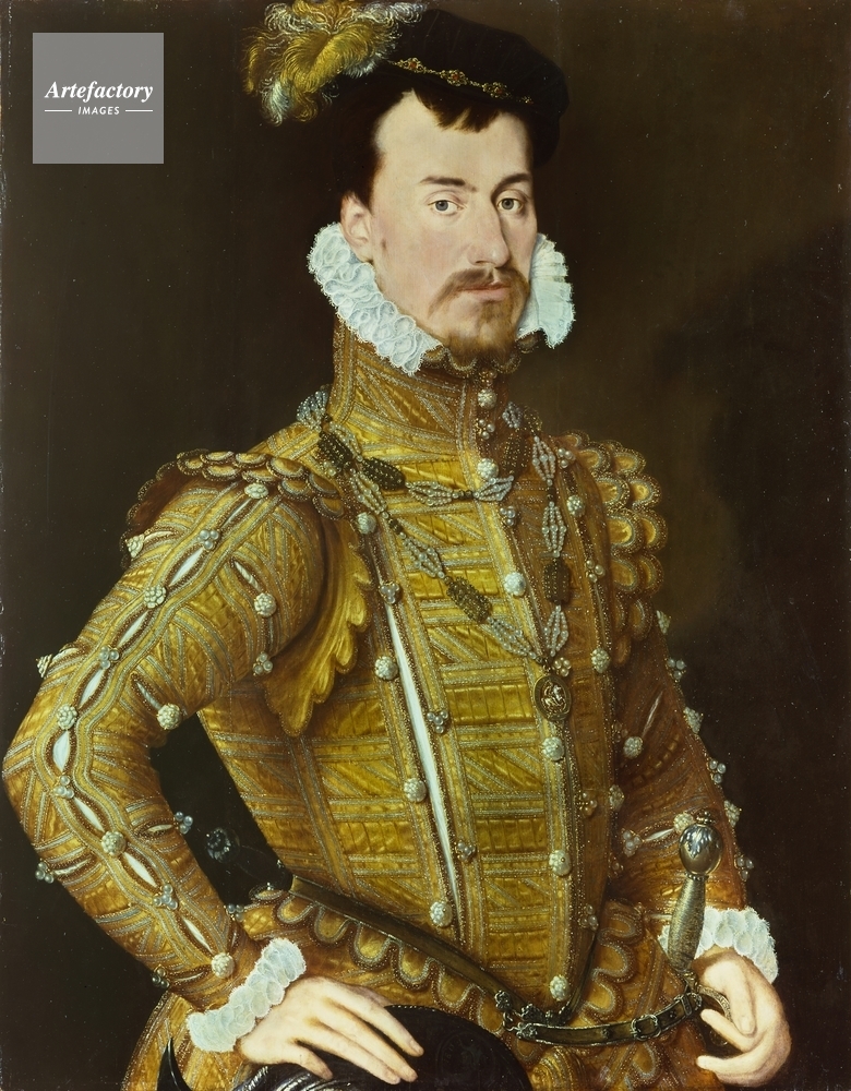 | キャプション | Half-length portrait of Robert Dudley, Earl of Leicester (1532?-88), in rich Court dress consisting of black velvet cap with jewelled hat-band and an embroidered golden-brown doublet decorated with pearls. His left hand rests on his sword hilt at his hip. | 制限事項 | ||