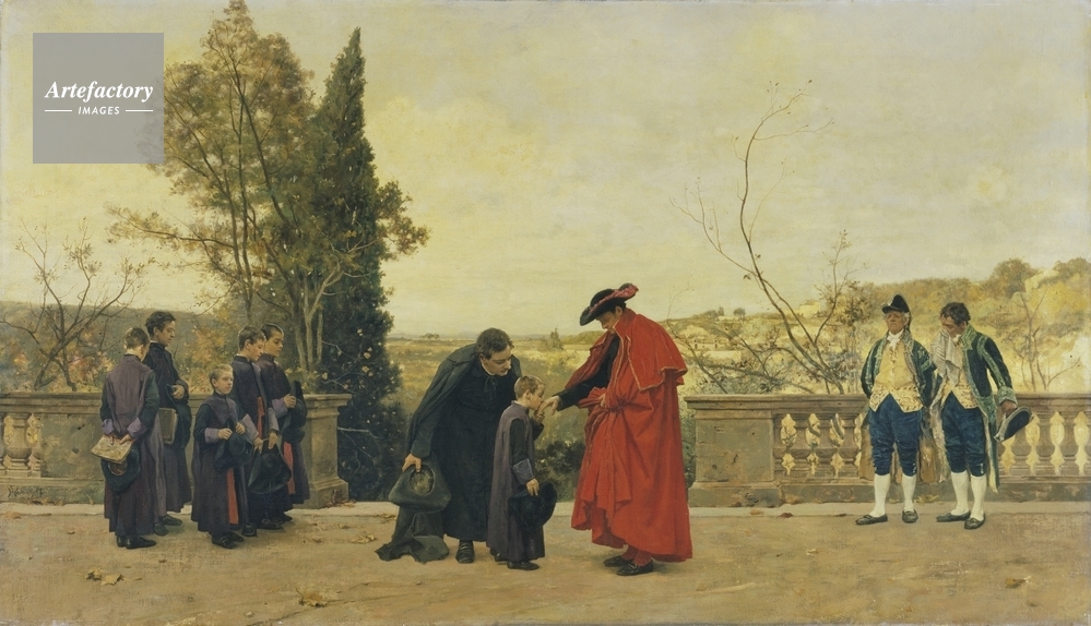 | キャプション | A Cardinal with seminarists on the Monte Pincio, Rome. He is dressed in red with a black hat, and his two attendants on the right are in green coats, blue breeches and black hats. The young seminarists on the left wear purple cloaks over black cassocks. | 制限事項 | ||