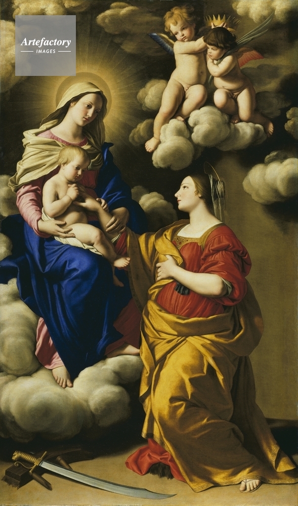 | キャプション | Saint Catherine, with her attributes the broken wheel and sword, kneels before the Virgin and Child who descend on clouds from Heaven. Christ places a ring on Saint Catherine's finger as angels wutga martyr's crown and palm watch from above. | 制限事項 | ||