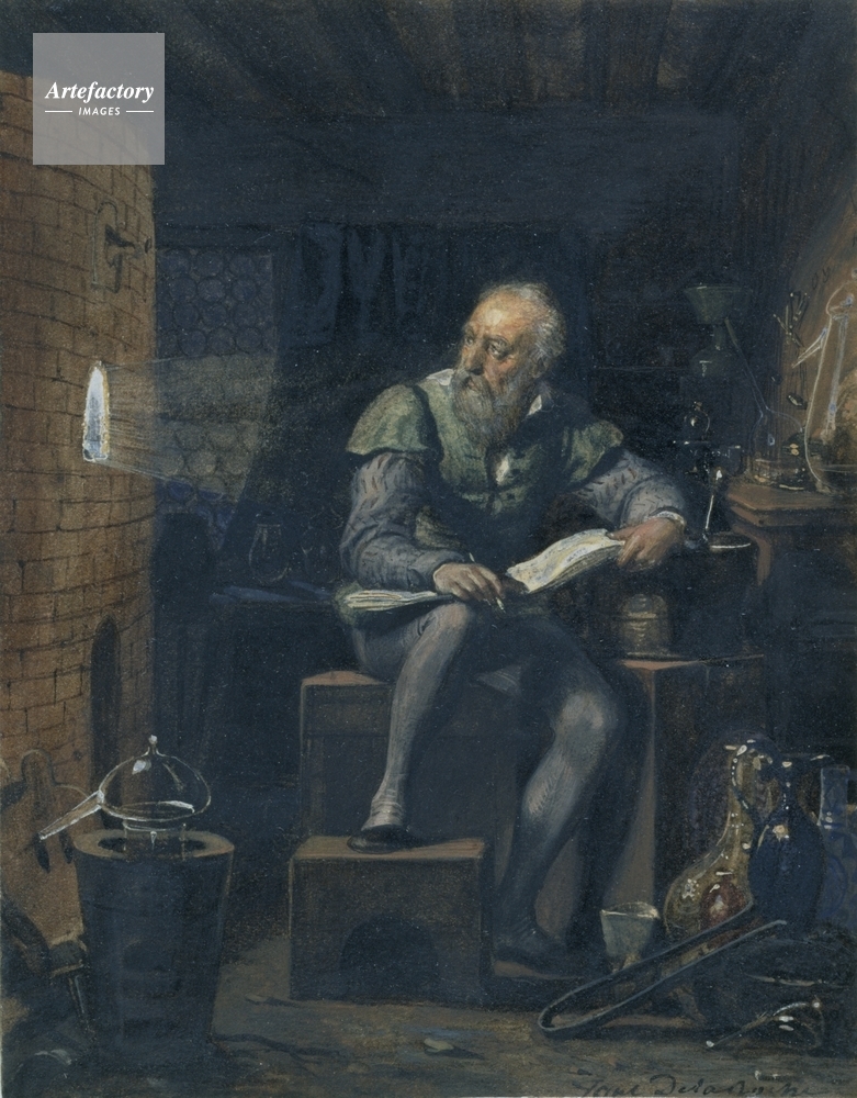 | キャプション | The potter Bernard Palissy (1510(?) -90) seated in his workshop, looking towards his kiln, from which light emanates. Balances, tongs, pestle and mortar and earthenware on the right. | 制限事項 | ||