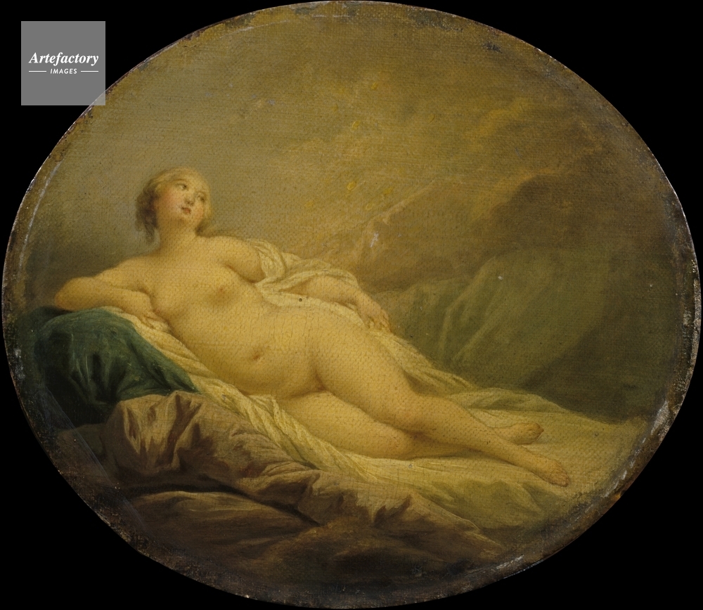 | キャプション | Oval painting depicting Danaë reclining on white, blue green and lavender draperies. Indistincly, above the reclining figure of Danaë, can be seen Jupiter disguised as a golden shower. | 制限事項 | ||