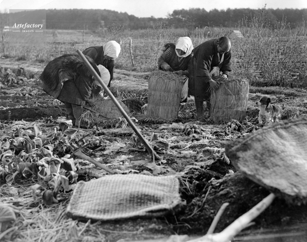 | キャプション | 霜にうたれた白菜畑で俵をつくろう農家の人たち(1934年撮影) | 制限事項 | ||